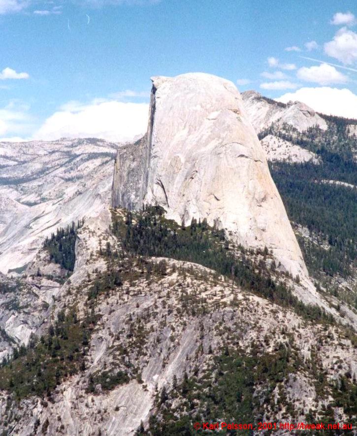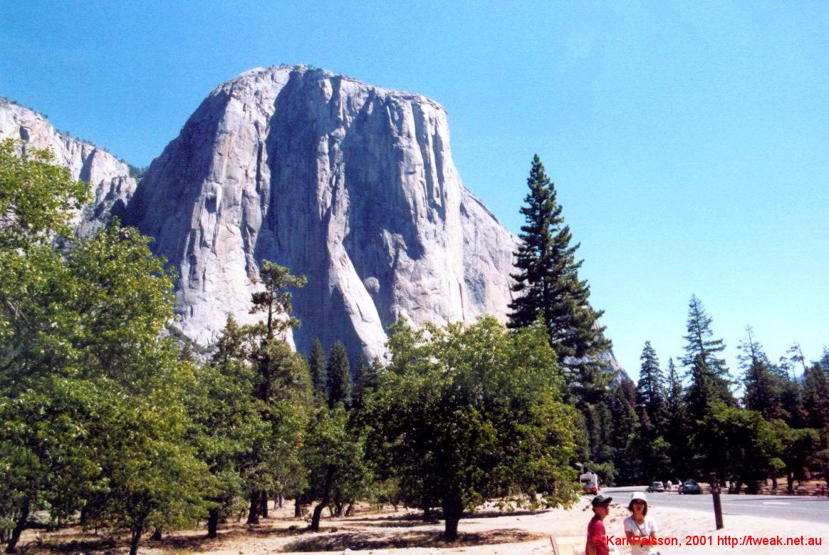 My First trip to yosemite! What a shambles the organisation was. We had about 8 people keen, but everyone had their own agendas. So we ended up with three mini trips. Greg and Steve wanted to leave friday afternoon, early, and were going to return saturday night. I wanted to go saturday morning, and return late sunday night. Adam and Jenna were going, but no-one had any idea when they were going, or even if they would go. The other distinction was that Nick, Mike and Myself wanted to go up Half Dome. Anastasia was along for the ride and was tough enough for anything. So we borrowed Greg's cisco car, an impressive Buick Regal. (Our cisco car had been returned by now, and mike didn't feel comfortable that his car would make the distance.) The buick was awesome, a total old persons car, but cool nonetheless. Stereo controls built into the steering wheel, split cabin climate control, v6 herbs for takeoff and landing. A real cruiser. We took off, early from my place, with the boot full of shit and headed up through livermore and out through stockton. I got tired and Nick took over for the drive down into the valley, and demonstrated why automatics should never be driven in the hills. At least, not by people who always drive automatics. Nice guy and all, but you've gotta use a lower gear dude. We got out just before one of the tunnels for our first look at the valley. Couldn't see much from here, but we could see a couple of groups of climbers on the wall above the road. (Cookie cliffs I believe) Headed on down into the valley for a better look, and also with the foolish goal of getting a campsite. Who were we kidding, the rangers actually even laughed at us. We had a great look at the valley, and went to camp 4 to see if greg and steve were around (They were on the waiting list there) Didn't find them, so went on up to bridalveil campground, on the southern valley rim, on the road to glacier point. Set up camp, quite a few sites remaining up here, then went off to check out glacier point. (It's just as well we did set up camp first, after glacier point we went down to bridal veil falls, down in the valley proper again, and by the time we came back up the camp was full)